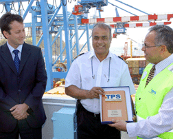 Saludando su primera recalada, TPS hizo entrega al “MSC Claudia” de un galvano recordatorio, acto al que también asistió el Gerente de la recientemente inaugurada sucursal en Valparaíso de MSC Chile, Mauricio Flores.